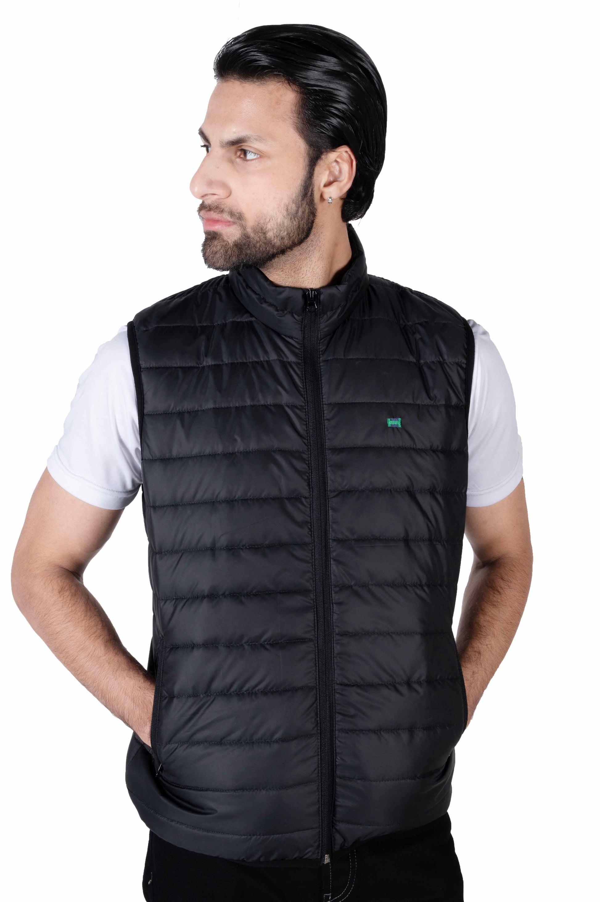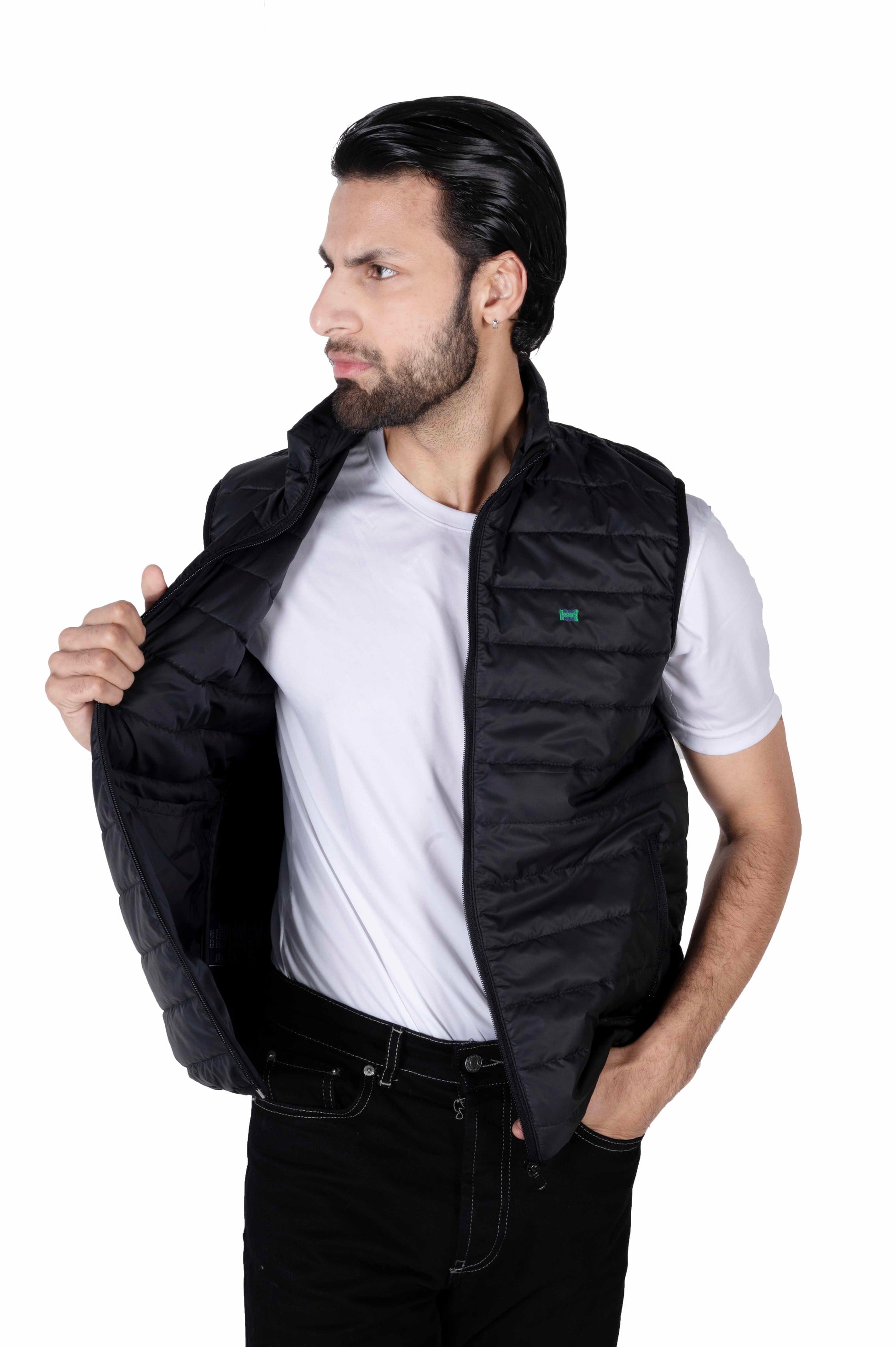 Men Black Quilted Short Body Slim-Fit Gilet Puffer Jacket